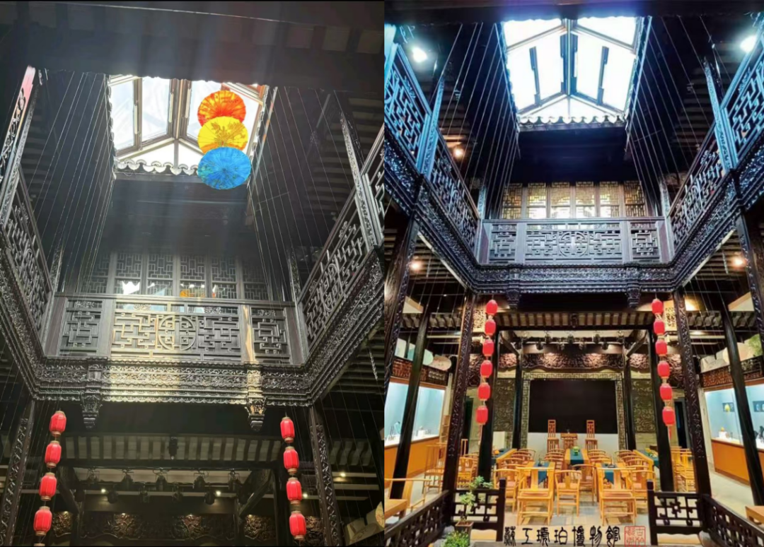 静声步入馆内的“思绩堂”大厅,充斥眼帘的便是沉淀在雕梁画栋间的千年光阴。同学们的目光首先被陈列于评弹舞台两侧的琥珀雕刻牢牢吸引:玻璃展柜内,历尽千万年孕育出的树脂化石,天然纹理如流动云雾,背景透光处晶莹温润;在非遗匠人的手下,它们幻化为了花鸟虫兽、山水人物,橙黄、蜜蜡、金珀,绚烂迷人、光彩夺目。