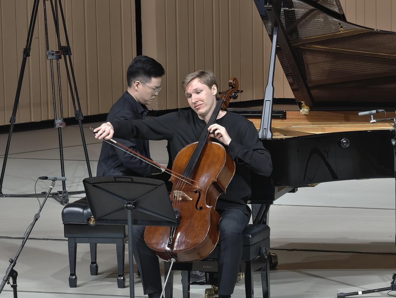 而当周思聪博士手上那翻飞的动作戛然而止、轻伏胸膛之时,演奏会特邀嘉宾Leon Hillebrands便手持大提琴从侧方登场。目光沉稳、屏息凝神,偕同第一串音符从键板与琴弦跳跃而出,舞动的琴音便与深沉的弦音完美地交织融合,以全新的元素与方式完美演绎出肖邦原作《如歌》的含情脉脉与醇厚笃深。