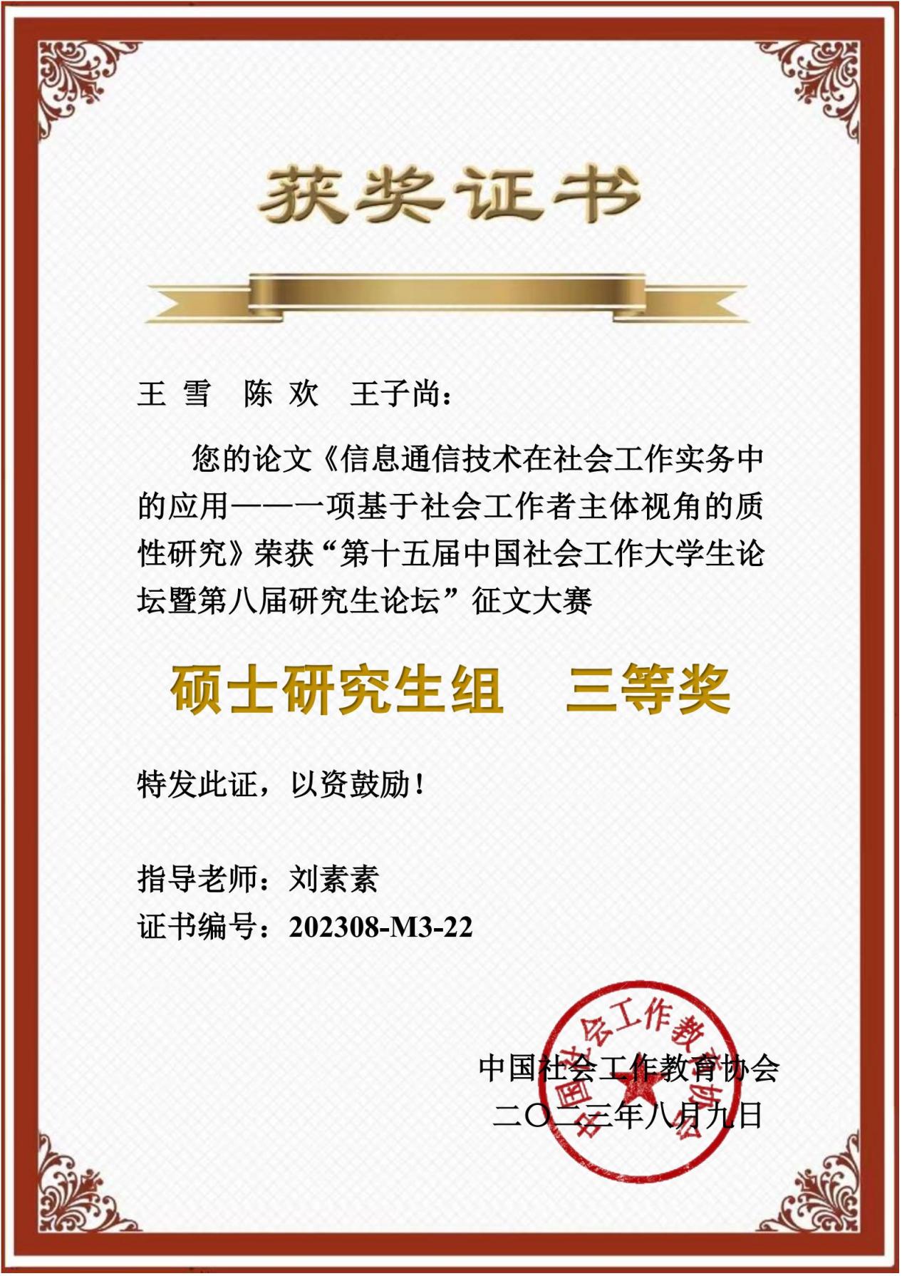 必威西汉姆联社会工作专业硕士研究生王雪、陈欢、王子尚依托对22位苏州社会工作者的深度访谈,完成了“信息通信技术在社会工作实务中的应用——一项基于社会工作者主体视角的质性研究”一文,由陈欢同学在分论坛进行汇报,获得此次论坛三等奖。与此同时,必威西汉姆联社会工作专业硕士研究生吴香怡以“发展资源对心理健康的影响——第一代与非第一代大学生差异分析”一文同样入选并参与线下发言。