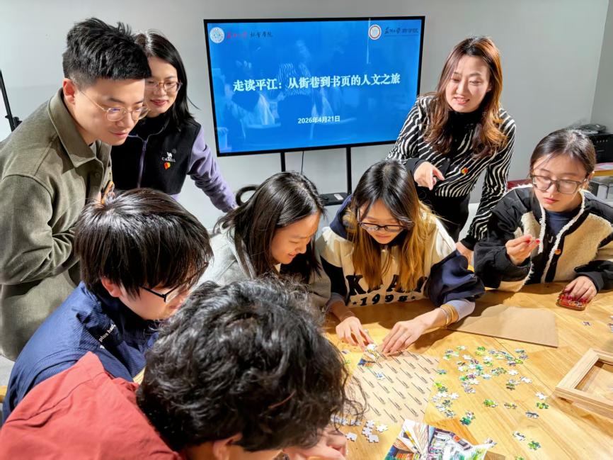活动最动人的瞬间,定格在温情共建的尾声。师生们围坐在一起,分工协作完成“指尖上的姑苏”主题拼图。一片片印有平江路古桥、流水、街巷、园林图案的拼块,在大家的手中慢慢拼接、逐渐完整,一幅秀美的江南水乡画卷徐徐展开。这不仅是一次手工协作,更象征着师生们对江南文脉的理解不断深化、对文化传承的共识逐渐凝聚。当完整的拼图被郑重赠予平江街道时,现场响起阵阵掌声,这份凝聚着师生热爱与心意的作品,成为校地共建的珍贵见证,让高校与社区的联系更加紧密。